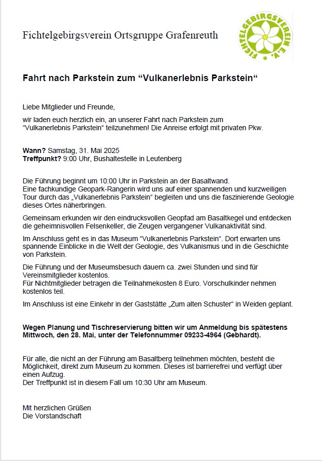 | Sa. 31.05 | Besichtigung Vulkanerlebnis in Parkstein mit anschließender Einkehr(Flyer jpg) |