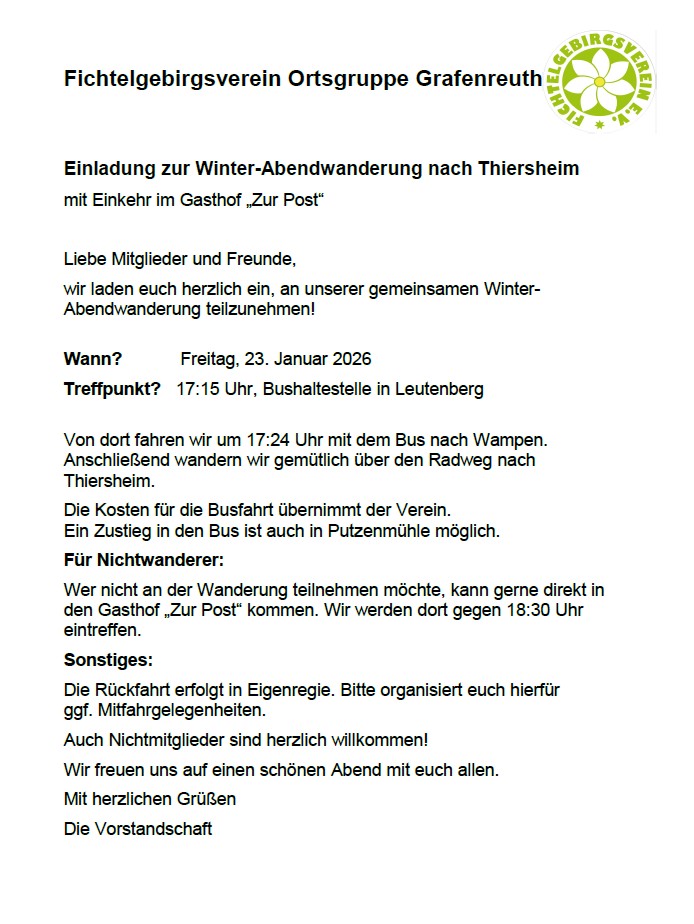 | Fr. 23.01. | Winter-Abendwanderung nach Thiersheim mit Einkehr „Zur Post“ ab 18 Uhr Flyer |